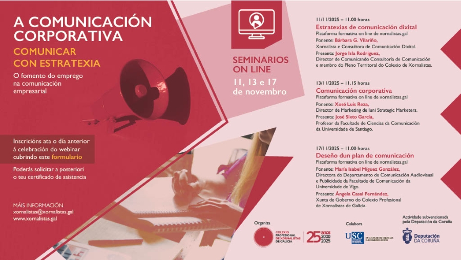O Colexio Profesional de Xornalistas de Galicia organiza nas mañás dos días 11, 13 e 17 de novembro A comunicación corporativa: Comunicar con estratexia, un ciclo de seminarios online que analizará aspectos como as estratexias de comunicación dixital, a comunicación corporativa ou o deseño dun plan de comunicación. A formación será impartida por Bárbara G. Vilariño, Xosé Luis Reza e María Isabel Míguez González e o programa complementarase cunha xornada presencial o 20 de novembro. A inscrición para participar nos diferentes seminarios, libre e gratuíta, xa está aberta. Todos eles se realizan coa subvención da Deputación da Coruña e a colaboración da Facultade de Ciencias da Comunicación da USC.